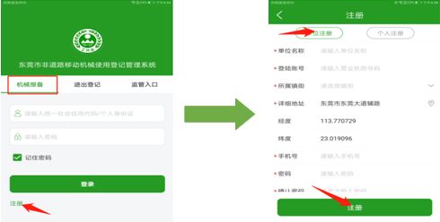 微信小程序登录页面,点击“机械报备”——“注册”——“个人注册”,输入星号必填项信息完成机械所有者个人信息注册,机械所有者个人用户微信小程序登录账号为个人身份证号码。