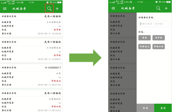 机械备案记录查询:点击“搜索”按钮,可根据输入或选择环保登记号码、审核状态信息进行条件筛选查询。